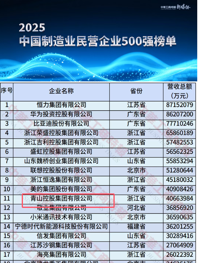 青山、振石、宏旺、甬金等上榜“2025中國民營企業500強”